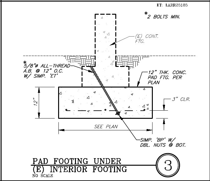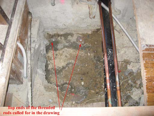 | What this means is that we have to dig two big holes in the middle of the house where those two neat gray rectangles are in the drawing on the left. (After cutting holes in the floor to get access to the crawlspace.) The holes go under the existing foundation. Then two 3/4" holes need to be drilled through the old foundation at each location for the threaded rods called for in the drawing on the left. | ||||||||