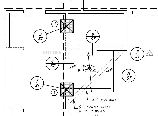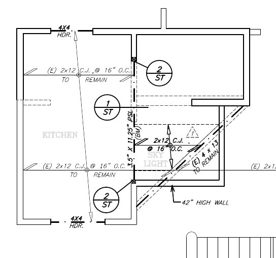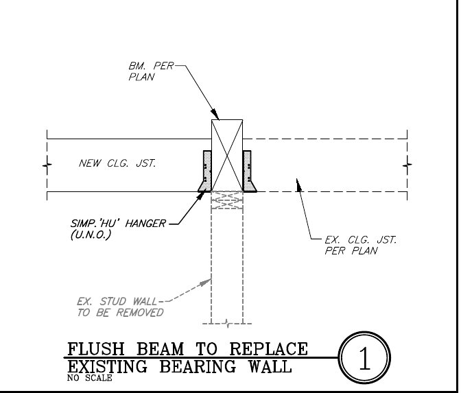 | July 27-August 3We get started on new structure to allow us to open up what was originally the exterior load-bearing wall of the house. Here's what the Engineer drew: | ||||||||