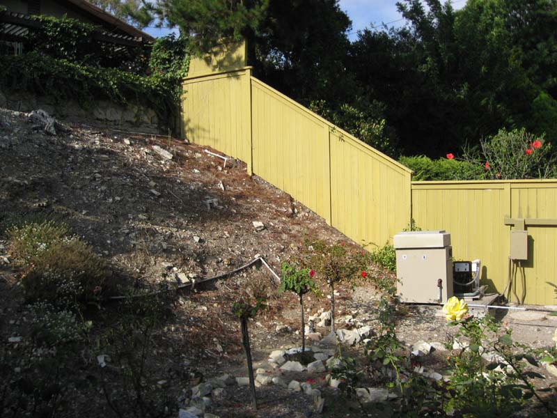Behind the garage we have this pitiful rose garden, and a total wasteland on the slope:
