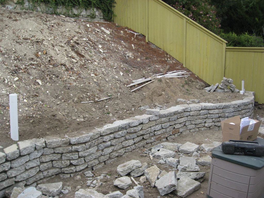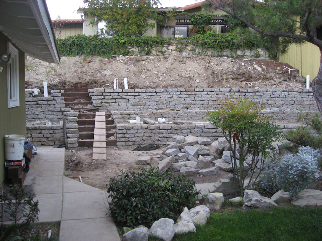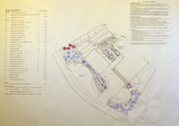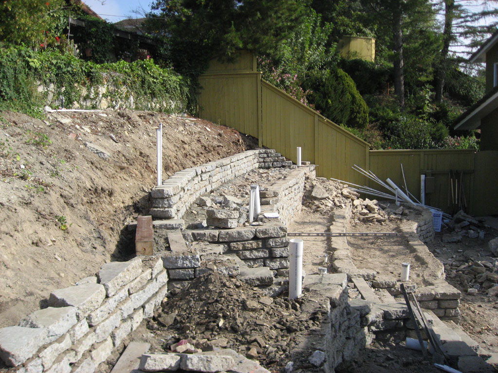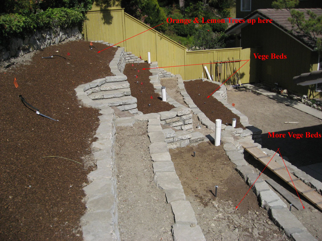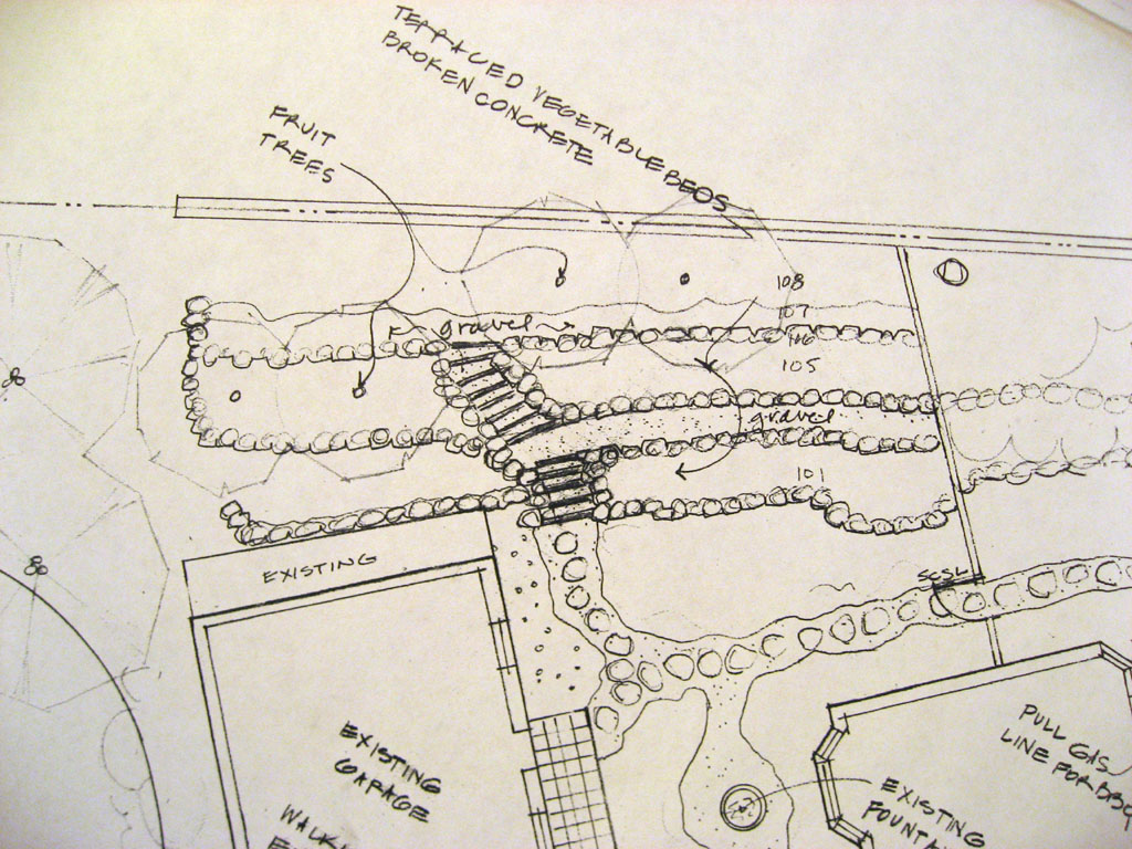 The first two terraces will become vegetable garden. (where the 101 and 105 elevation notes are on the drawing). The space between the walk and the first wall will be rose garden.