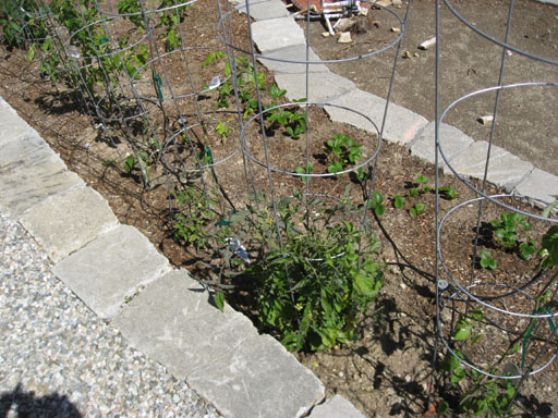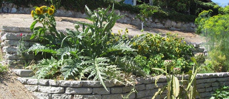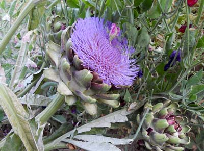 | Tomatos in their Cages, Strawberries behind | Artichokes! | |