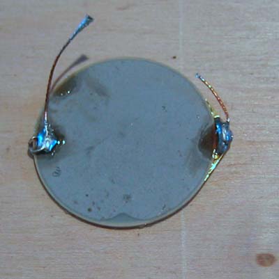 | Making the sensorI fabricated my own sensor from a piezo-electric disk salvaged from a Radio Shack Tweeter. (Cost less than $10). Radio Shack also sells Piezo-electric elements like this one: Which would probably work as well. Also electronic watches with beepers in them will have very similar elements (usually cemented to the back cover). So that might be a place to scavange an element as well. | |
