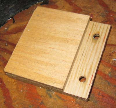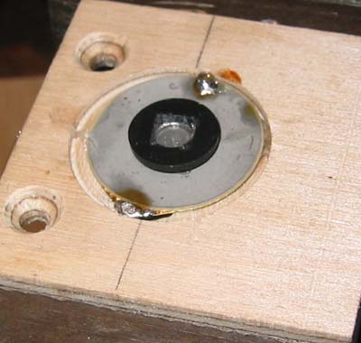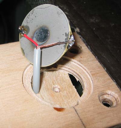 Then used a forstner bit to create a well in the plywood to hold the peizo sensor. First a 1" bit to create a well large enough to hold the sensor, then a 3/4" bit to create a space behind the sensor to allow it room to vibrate freely. I used my Moto tool to add a couple of "ears" to the smaller cutout to provide clearance for the soldered connections on the sensor. |  |