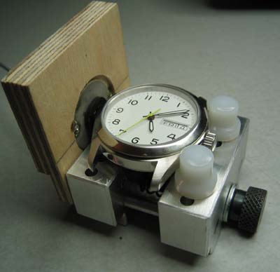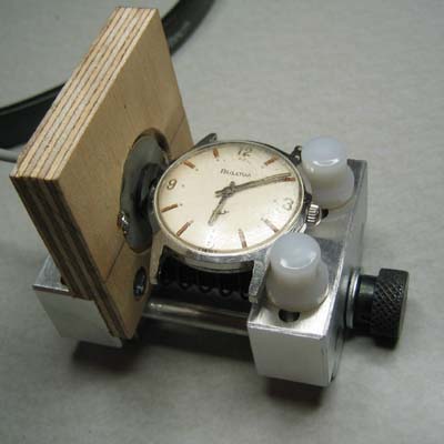Here's a watch under test. I immediately discovered a flaw in the design -- the jaws of the holder won't open wide enough for most men's watches. This little Bulova only barely fit. |