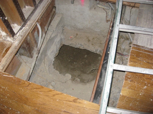 | What this means is that we have to dig two big holes in the middle of the house where those two neat gray rectangles are in the drawing on the left. (After cutting holes in the floor to get access to the crawlspace.) The holes go under the existing foundation. Then two 3/4" holes need to be drilled through the old foundation at each location for the threaded rods called for in the drawing on the left. | ||||||||