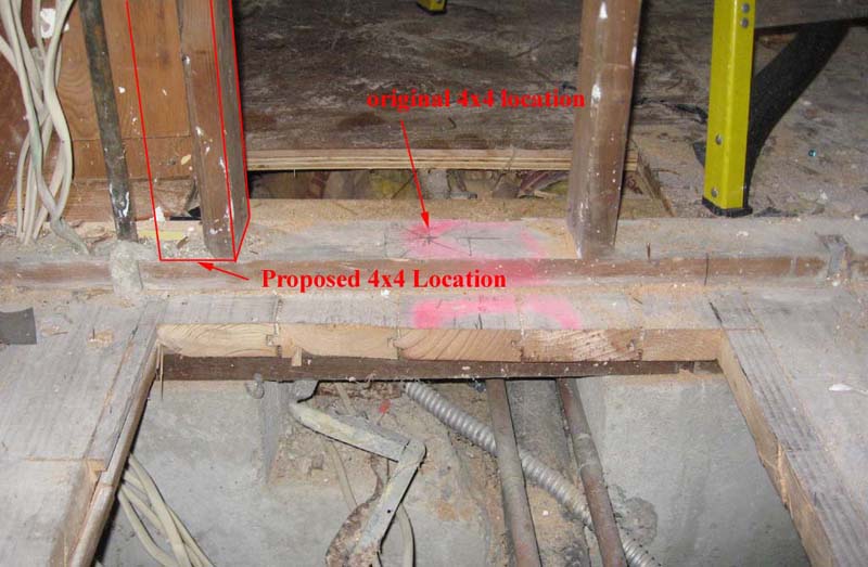 And we have a problem. As you can see in the picture where the 4x4 is supposed to go is directly a gap in the upper part of the footing. This once was a crawl space vent (before the 1990 remodel to the house) and now is serving as a passage for utilities, all of which we need to keep! After briefly debating ways to block the gap and carry the load down to that massive new foundation pad, we determine that he easiest solution is to move the post as shown in the picture and make the beam 1' longer. So this picture was sent off to the engineer who was able to verify that we could make the beam longer with the same size timber. | |||||||